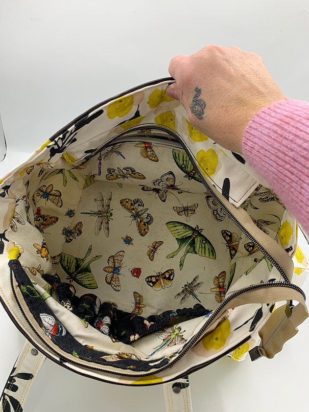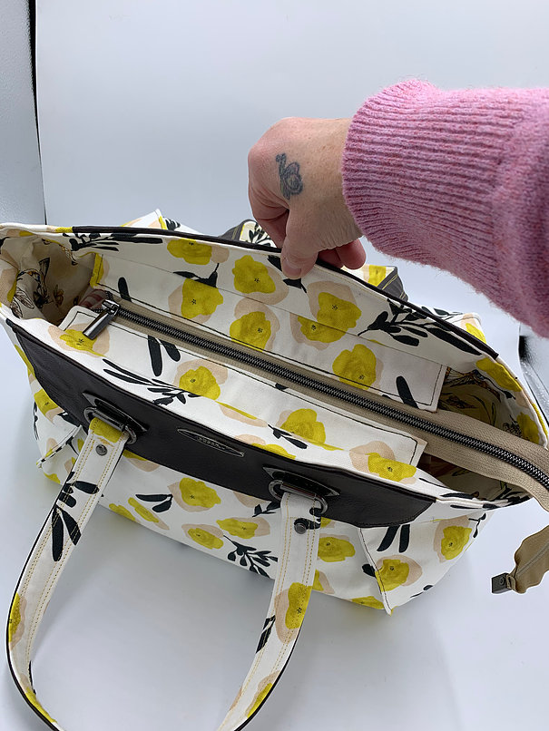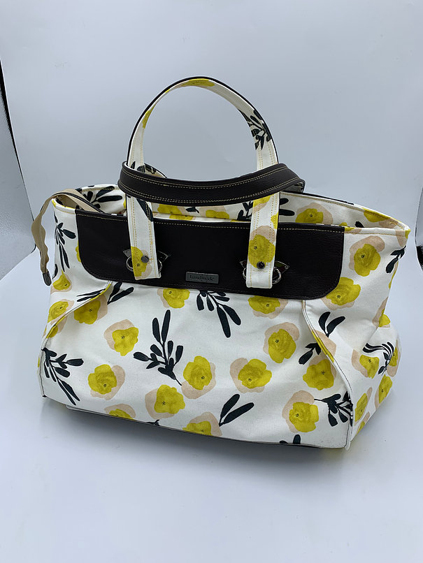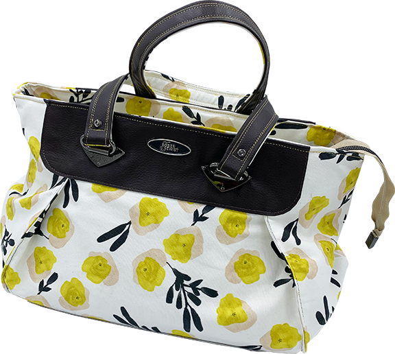 If you need a big bag- this is it! but you can still be organized- the inside has a zipper pocket on one side and 2 really awesome gathered pockets- so you dont lose small stuff. Love the handles- soft brown vinyl and fabric. Measures 16″ long, 11″ tall, not including handles- which are 9″ (in half)- fun springy fabric!