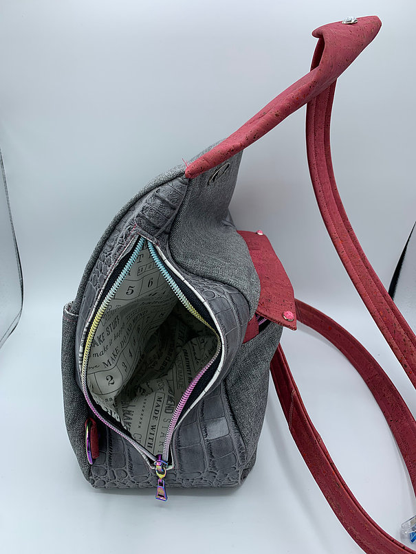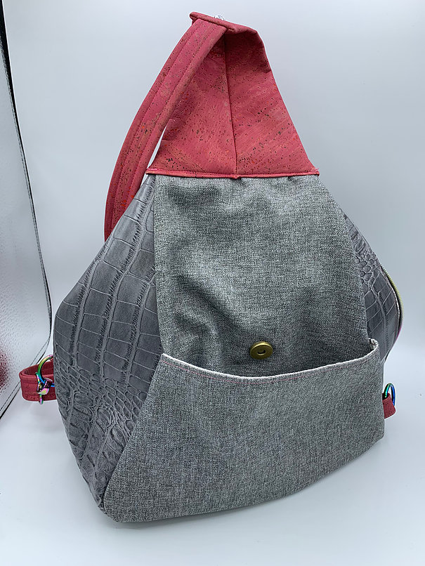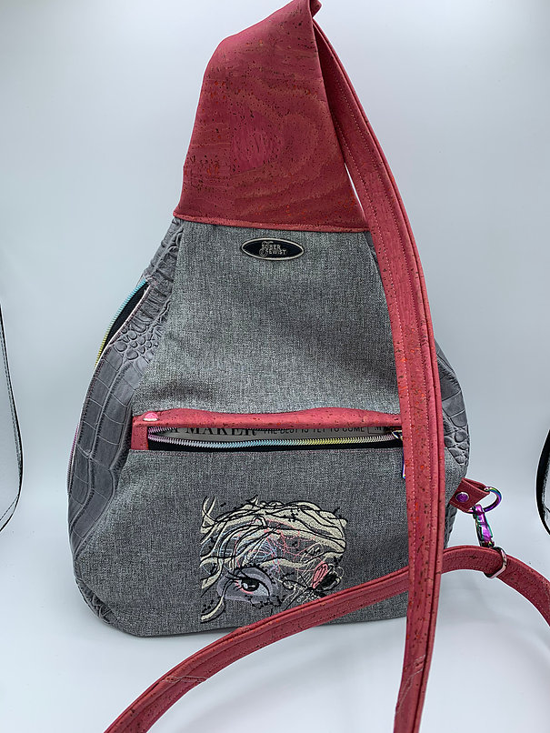 This chic back-pack is definetely an every day, and even into the “date” night… Plenty of room to hold a ton of “stuff”- you know how we are with our “stuff”- lol I have a gray croccodile vinyl and beautiful pink cork accents. The zip pocket in the front is a long and narrow pocket- and then, there is a roomy totally separate back pocket, with a magnetic closure. then on the side another zip pocket for the whole inside! This pack measures 19″ tall by 10″ wide, and it is 5″ deep around the bottom. I also added a beautiful embroidered face to the front!